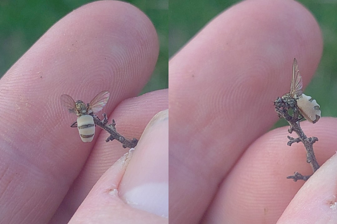 Almost exactly a month later I encountered the flies perched atop my plants yet again. This time however it was a group of flies rather than just one, and each fly had fuzzy white clumps protruding from their bodies. Again they laid motionless atop my seedlings as if they had been glued to the tops of the twigs. I captured a few more photos to post on iNaturalist to see again if I could determine what on earth had happened to these flies