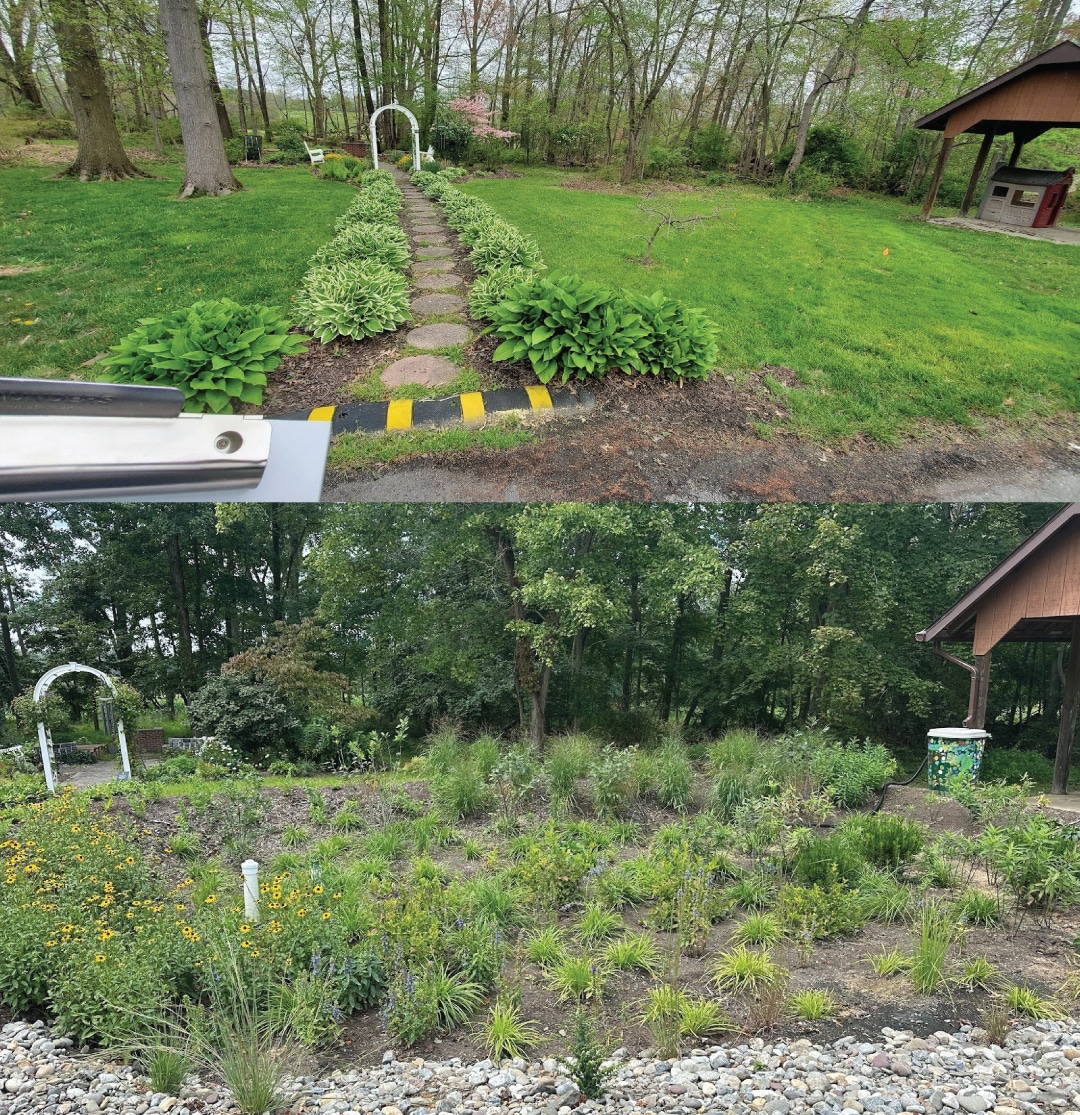 Top, pre-construction site conditions. Water from the parking lot flowed straight over the grass and settled in the garden space near the back of the image creating a soggy garden space. Bottom, one of the constructed bioretention cells featuring native plants throughout, rain barrels on the right to capture rainfall from the pavilion’s roof, and an underdrain on the left side of the image. To assist in water-infiltrating efficiently, an underdrain assists by pulling the water out of the system and releasing it nearby gradually.