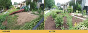 A steep-sloping front yard on a property in Washington, D.C. is transformed with a conservation landscaping installation consisting of native plants and mulch.4