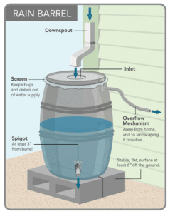 A rain barrel is a containment system connected to your downspout that collects rain water from a roof to store water for later use. Stored rainwater can be used around the outside of the home for watering gardens, lawns, and even car washing.