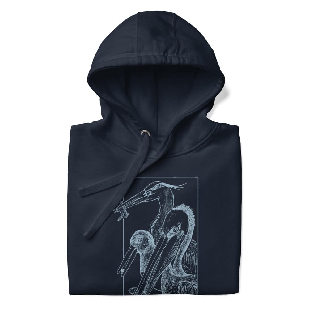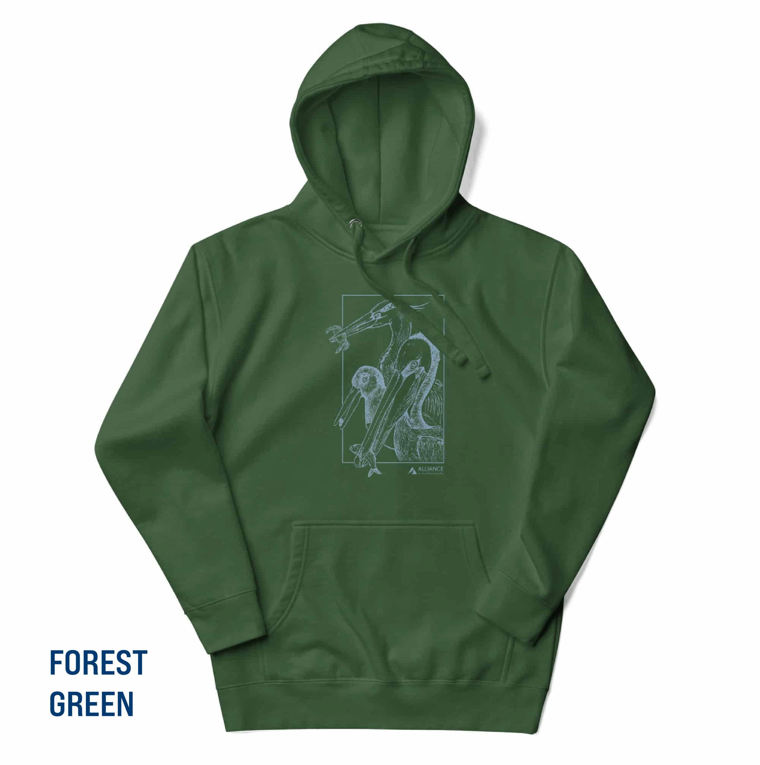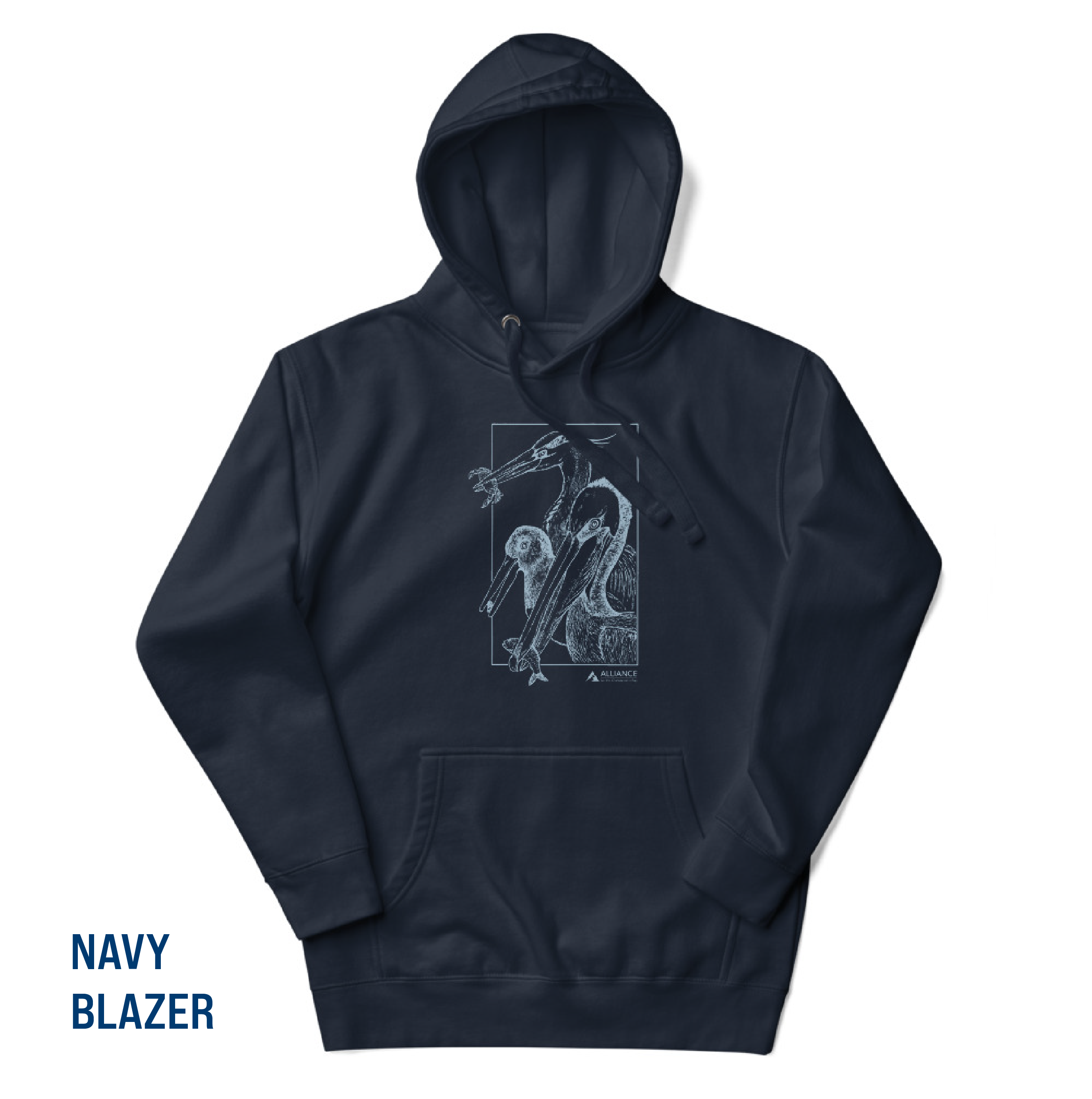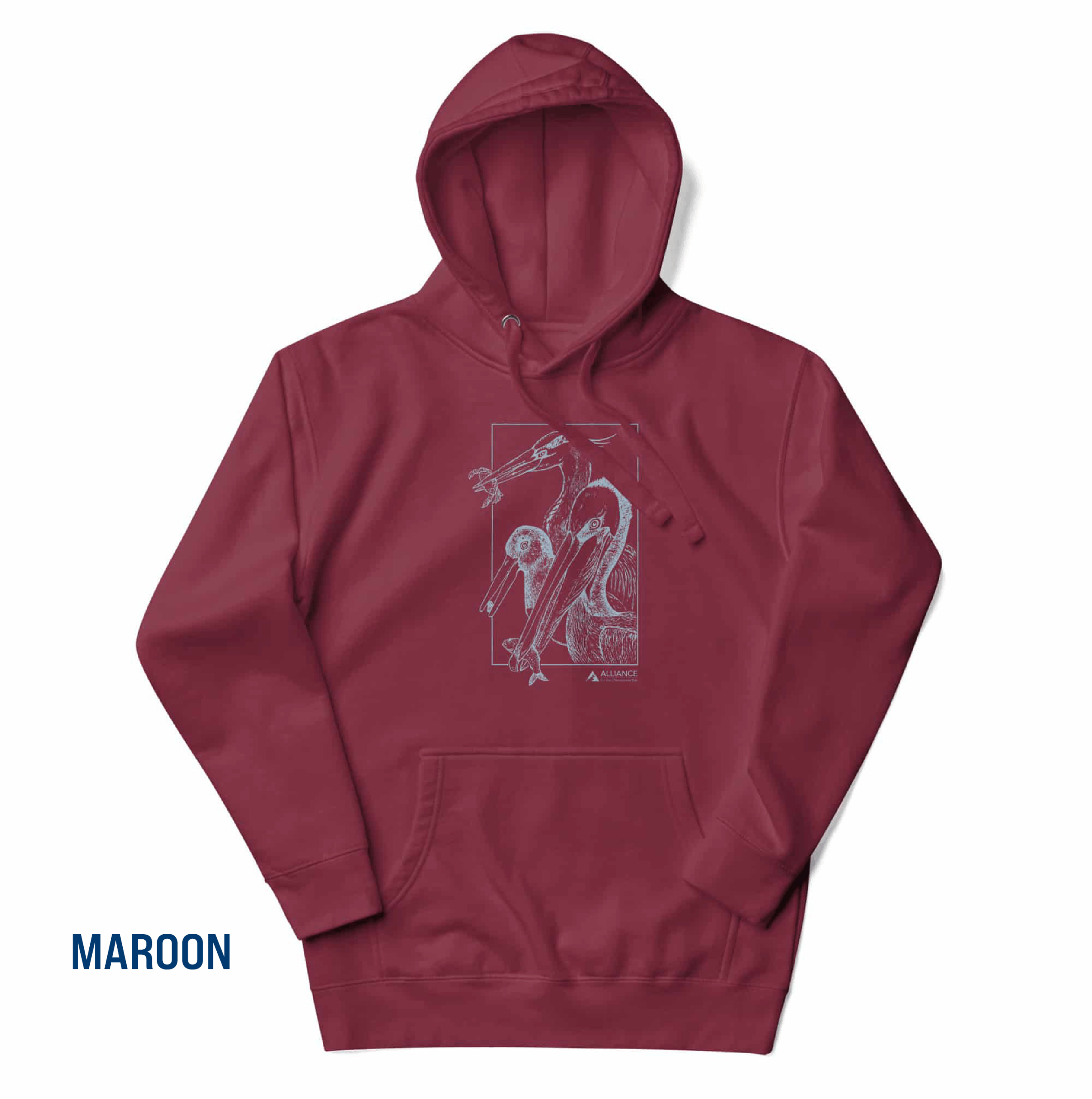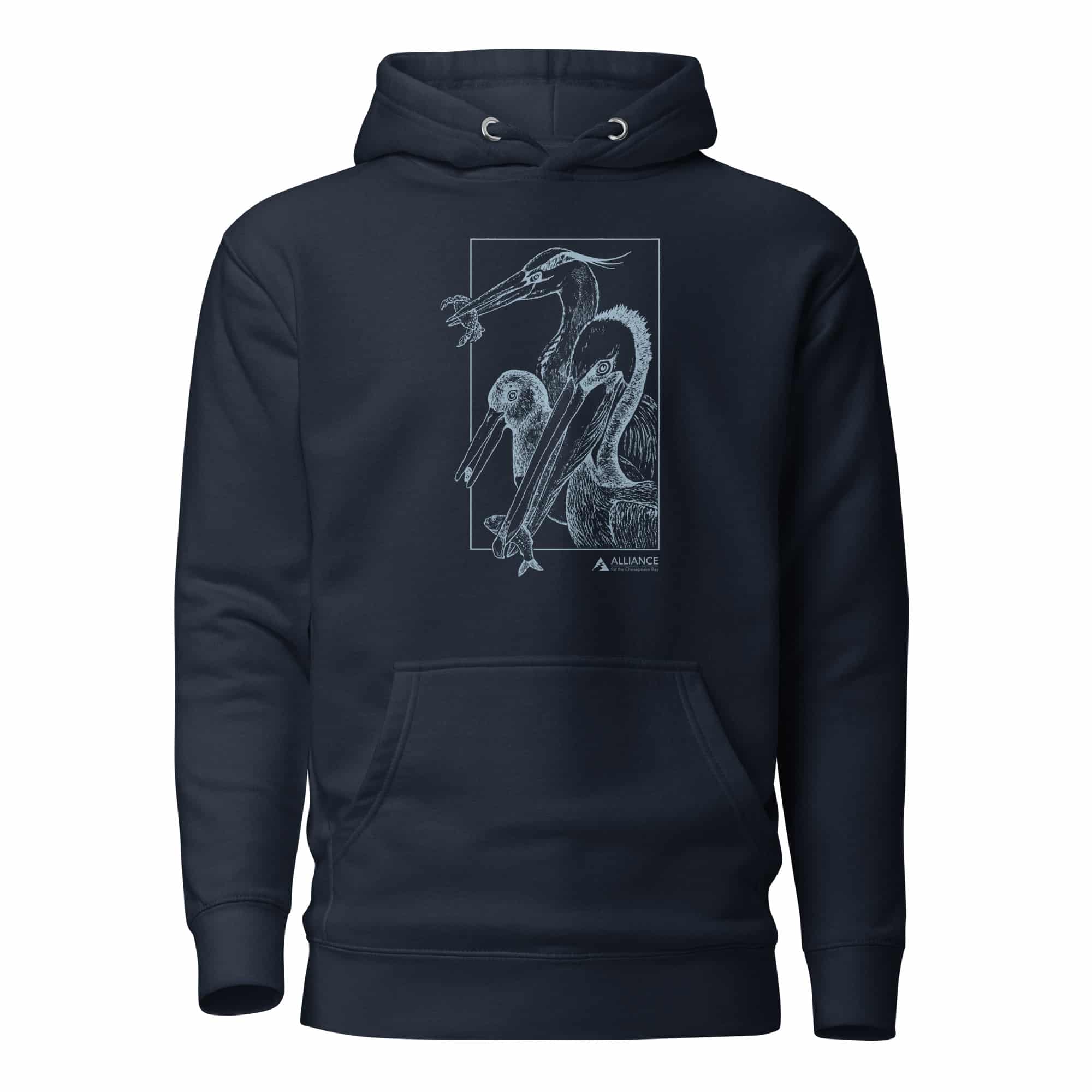 Our Bay Birds design is now offered in a hoodie! Adapted from the Alliance’s artwork archives, this Bay Birds hoodie allows you to show off a few Chesapeake-native avian species in style: Great Blue Heron (Ardea herodias), American Oystercatcher (Haematopus palliatus), and Brown pelican (Pelecanus occidentalis).